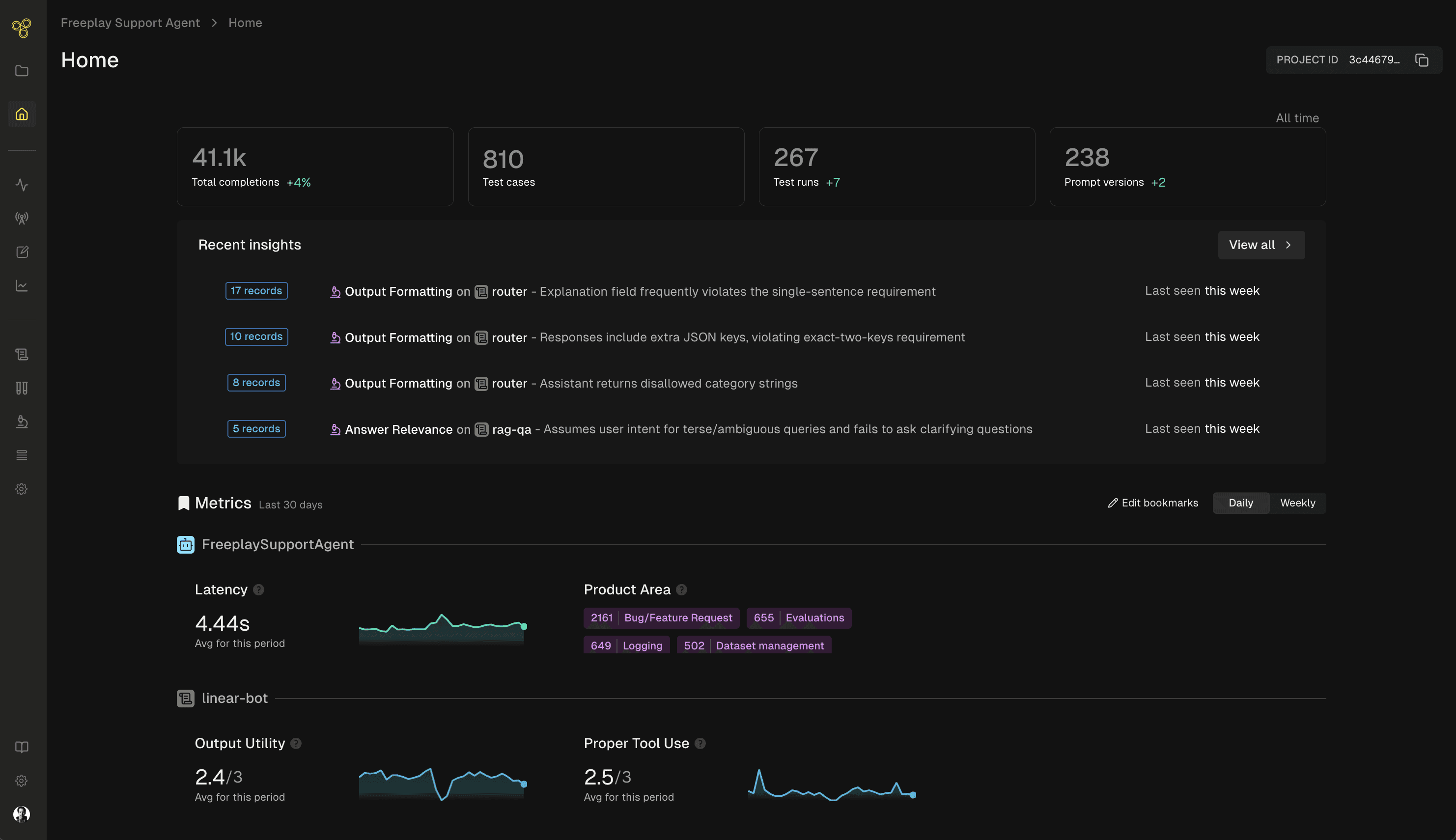 Insights on production logs is live now. Check the Insights tab in your project to see what Freeplay found in your data this week. Docs are here.