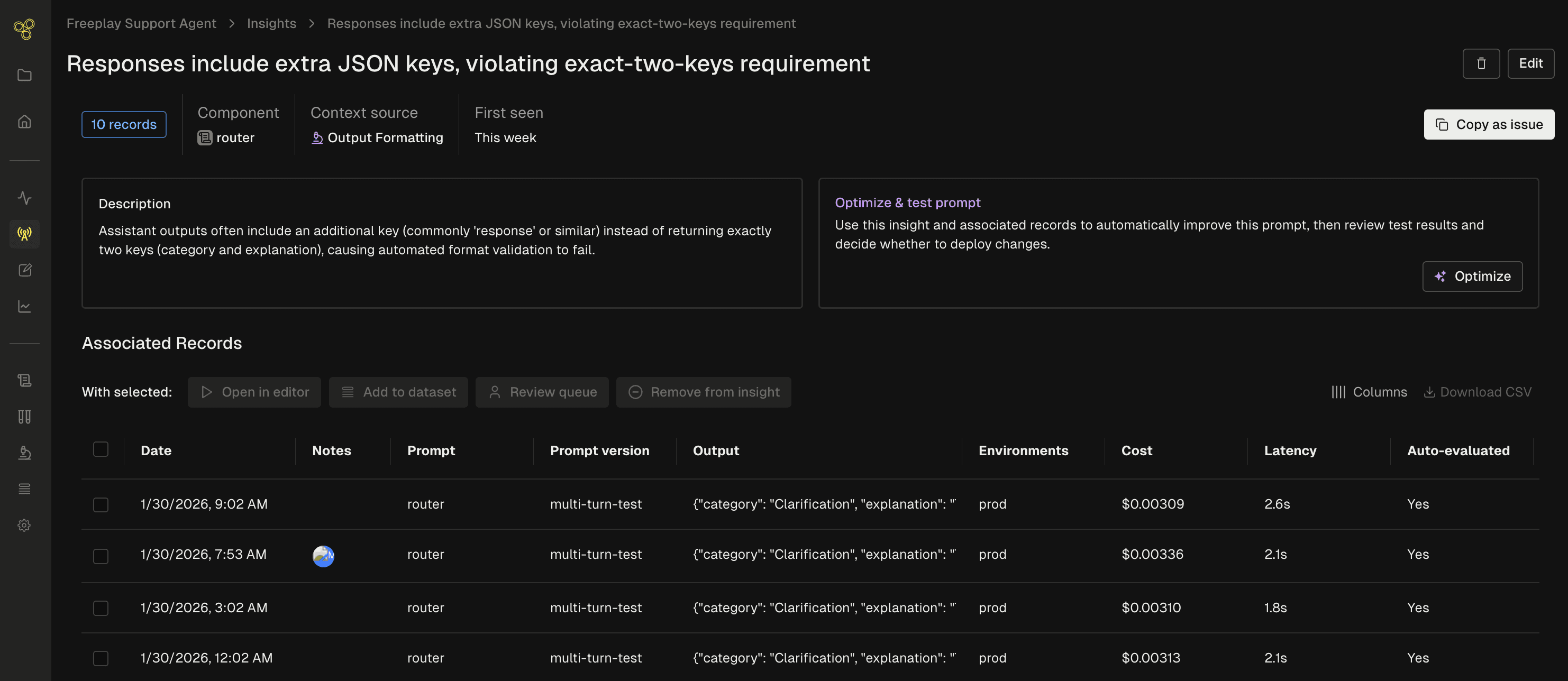 For each insight, you get a clear description of the problem and an easy link to the underlying traces that back it up. Then you can take immediate action as part of Freeplay’s connected workflows: