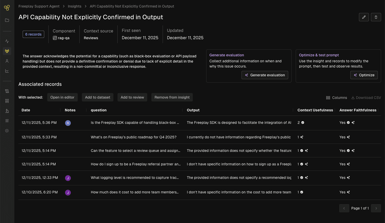 Then once you learn something new, there are a range of actions you might want to take. We’ve built Freeplay from the beginning to make it really easy to connect data from one step to the next for the sake of faster iteration, and that continues here.